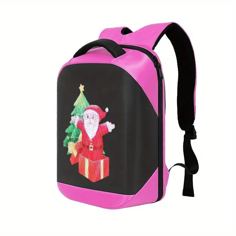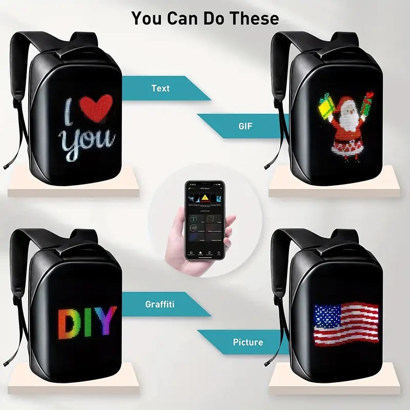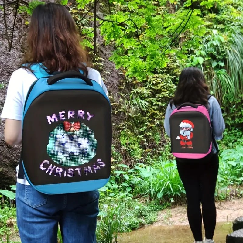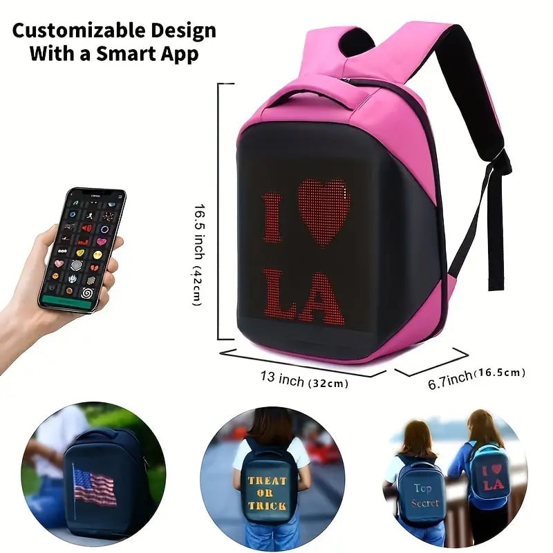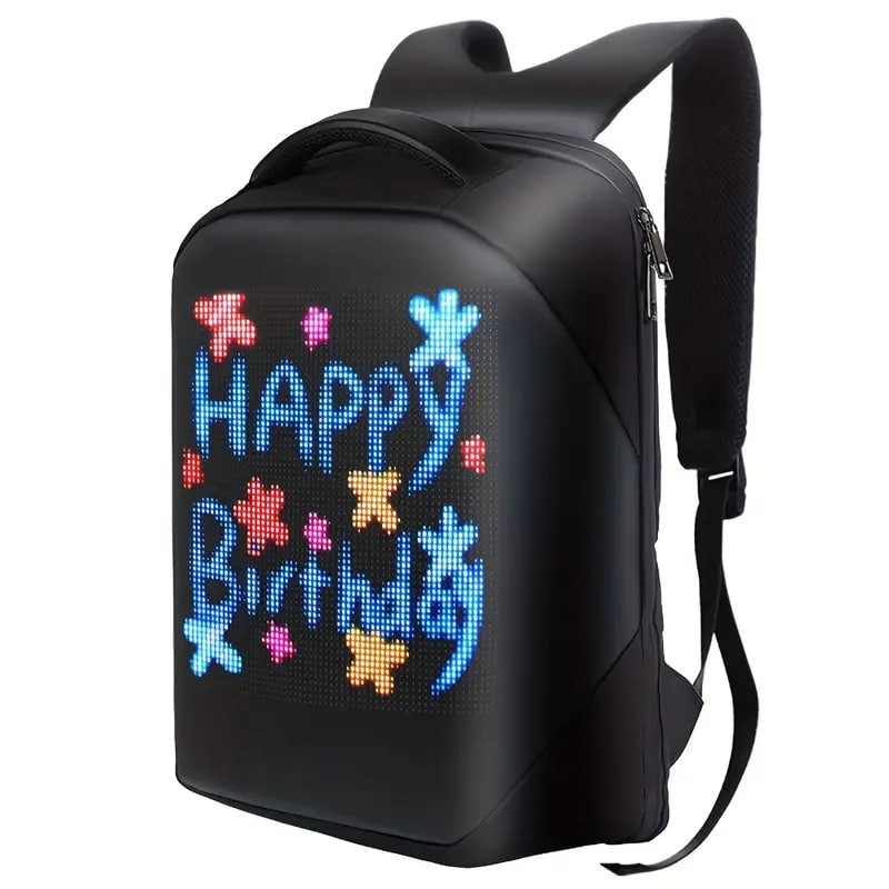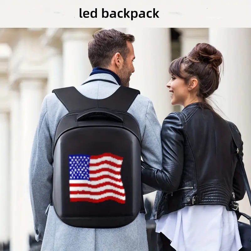 Product features: backpack with display screen, sense of technology, trend Highlight: smart APP control, wifi backpack Product category: pixel bag, smart backpack, pixel bag, led backpack 1: If you need to clean the backpack, please take out the screen to avoid water damage. 2: The mobile APP control can change the display of text and pictures, and the animation can be displayed in various ways. 3,Please noted that for transportation safety, we do not provide mobile power,backpack only.