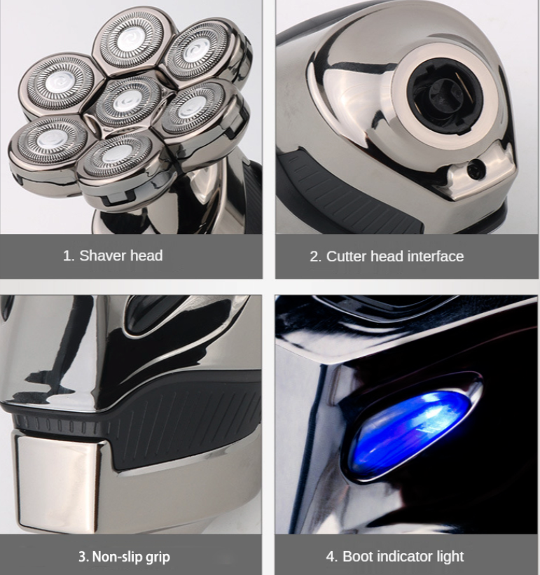 Men's Multifunctional Electric Shaver includes six detachable accessories, including 7-head razor, hair clipper, nose trimmer, facial cleansing brush, body trimmer and hairbrush for different hair and beard styles. Meets all your shaving and facials needs.