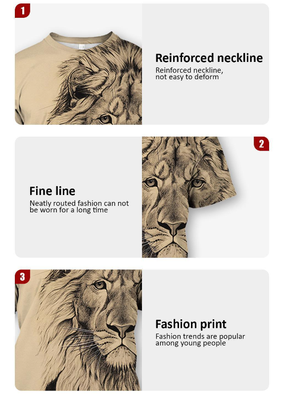 • Captivating 3D printed design: This men's t-shirt features a captivating and lifelike 3D printed image of an animal lion, adding a unique and bold statement to your summer wardrobe.
