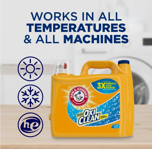 ARM & HAMMER Plus OxiClean Liquid Laundry Detergent is ideal in standard and High Efficiency (HE) washing machines. This low-sudsing, clean-rinsing fresh scent detergent delivers 5 powerful cleaning benefits in 1: it attacks stains, fights odors, whitens whites, brightens colors and delivers a boost of freshness. This laundry detergent powers out microscopic stains and dirt to deliver a hygienic clean. Concentrated with 3X powerful stain fighters in every load versus the leading value detergent, this HE detergent is powerful enough to handle your toughest loads in all wash temperatures, even cold water. Supercharged with OxiClean stain fighters to attack over 101 tough stains This HE laundry detergent keeps whites whiter and brights brighter (vs regular ARM & HAMMER).