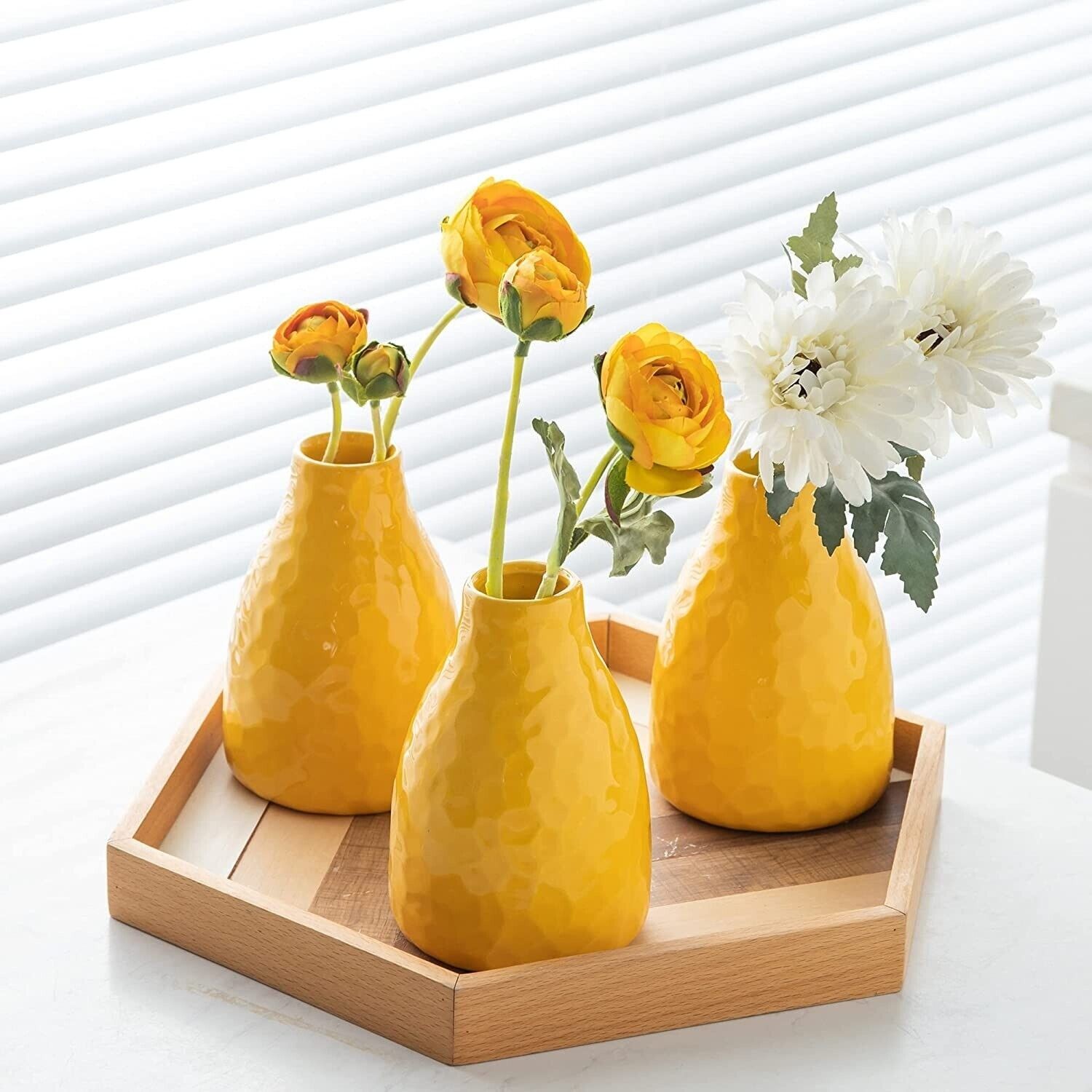 Home Living Room Decor Set of 3 Small Yellow Stoneware Ceramic Flowers Vase
