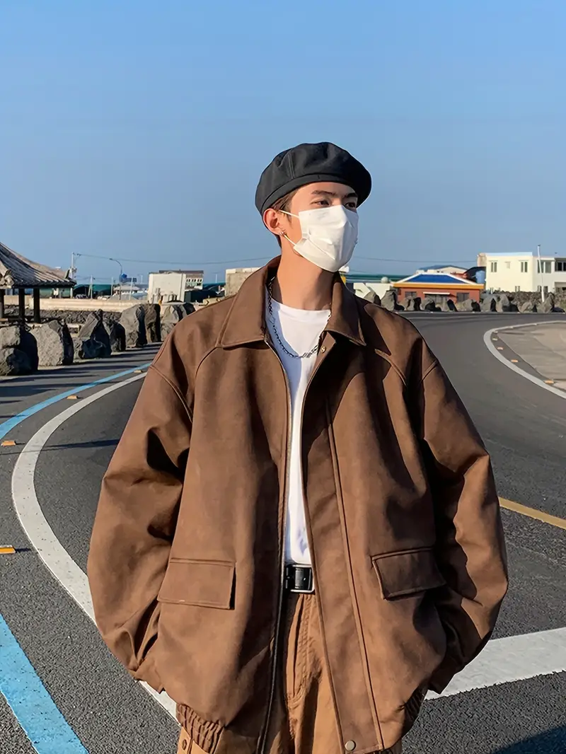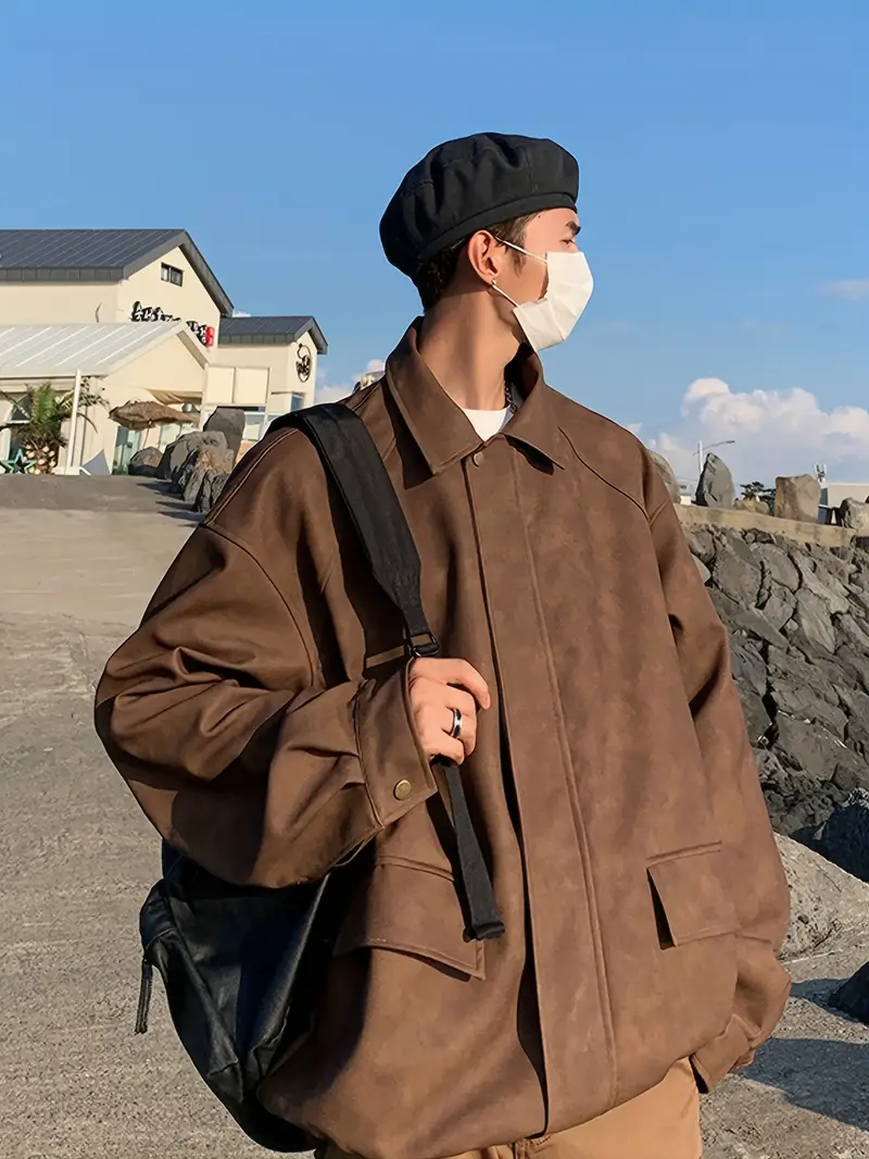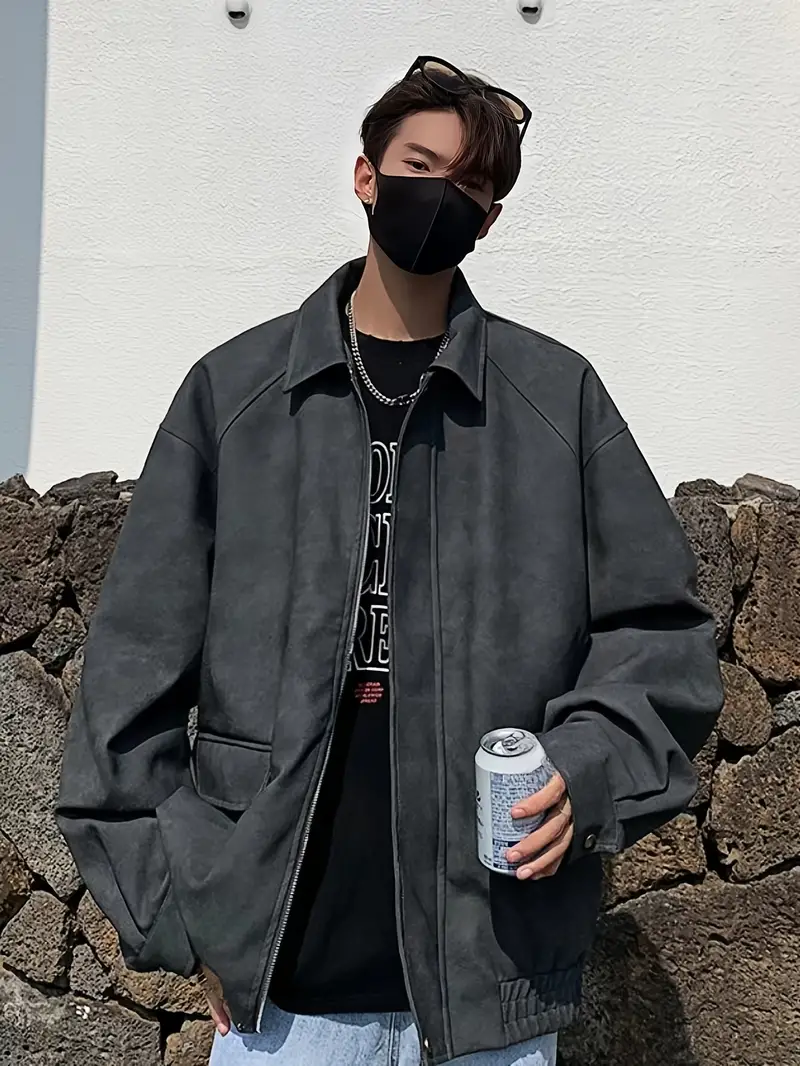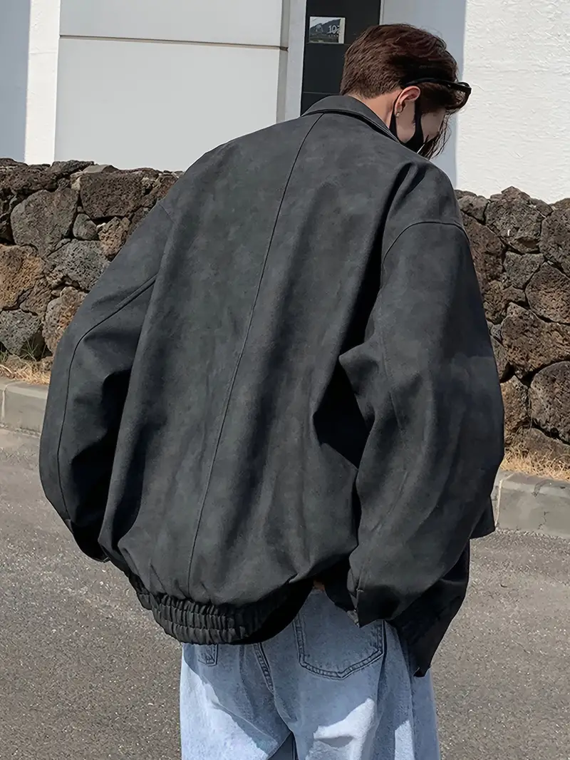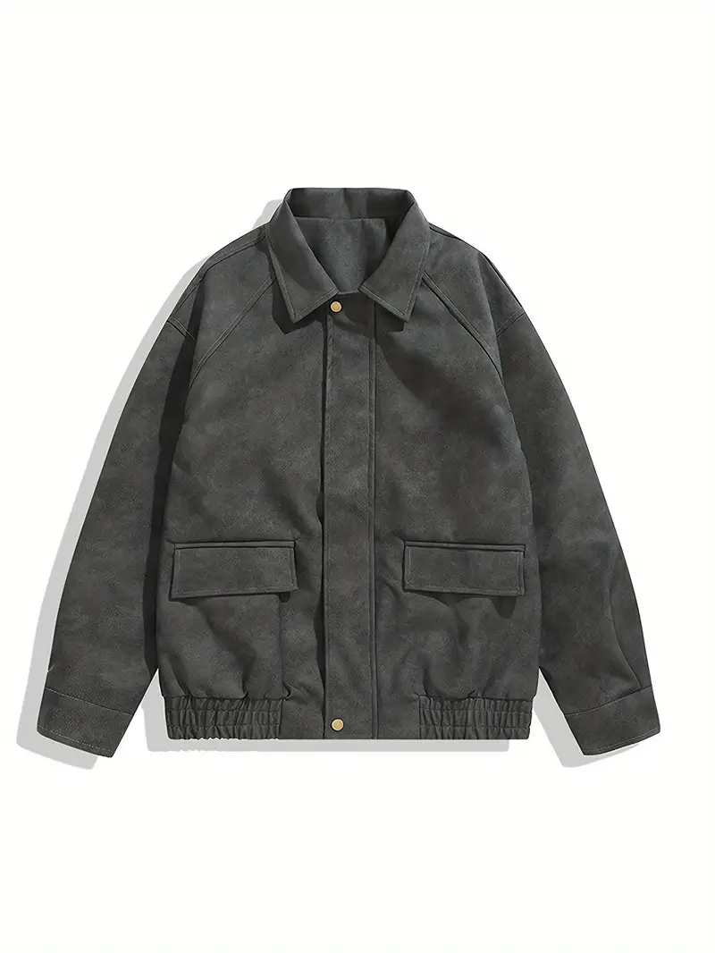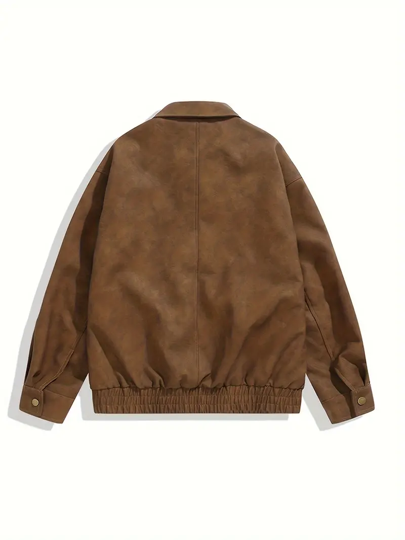 Men's Stylish Vintage Style Faux Leather Jacket With Pockets, Casual Breathable Lapel Zip Up Long Sleeve Jacket For Outdoor Activities