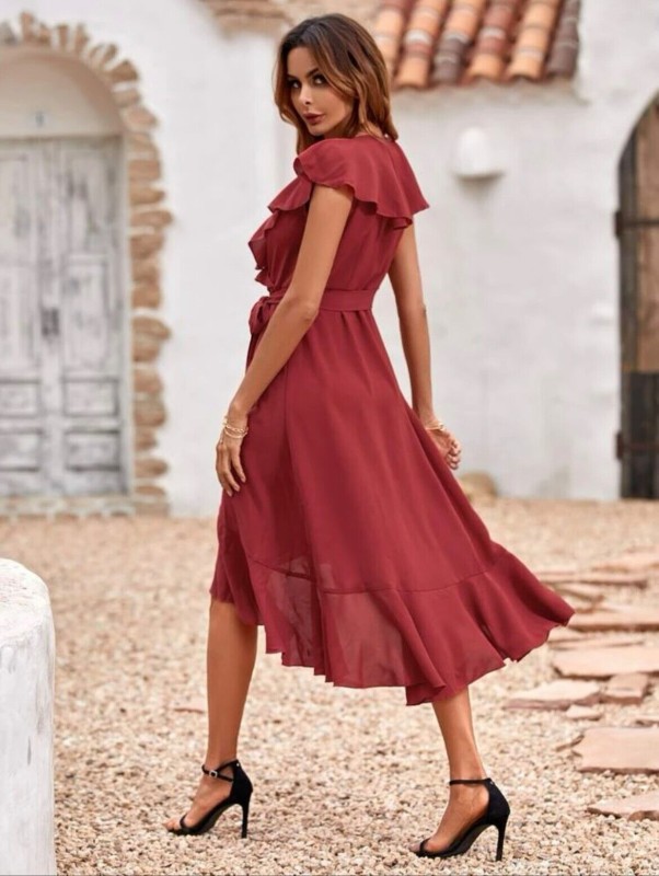 Solid Ruffle Trim Belted Wrap Dress