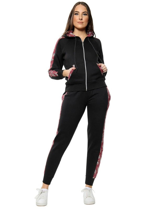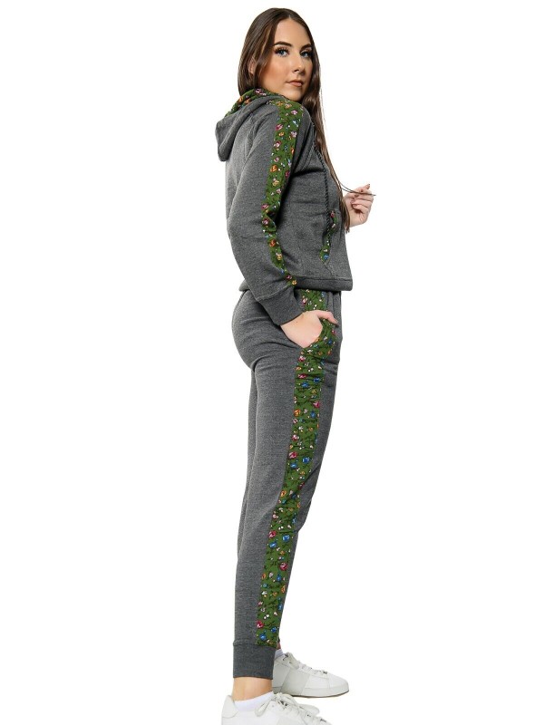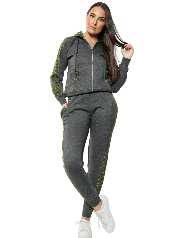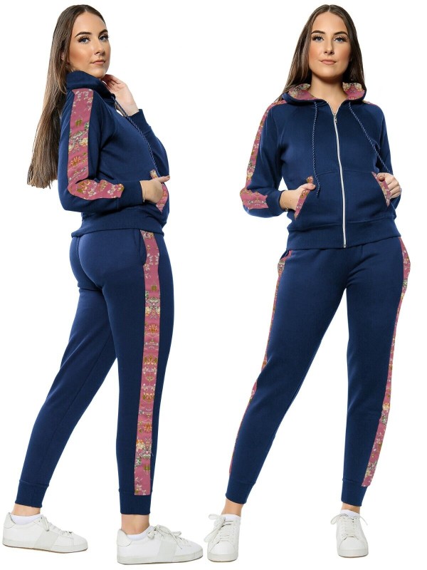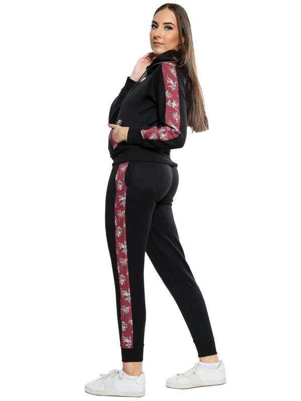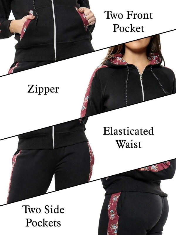 Fleece, Hooded, Floral Side Panel, Windproof, Elastic Waist, Comfort, Sports, Drawstring, Stretch, Thermal, Sport Suit, Moisture Wicking, Side Stripe, Pockets, Lightweight, Lounge Suit, Zipper, Jogging Pants