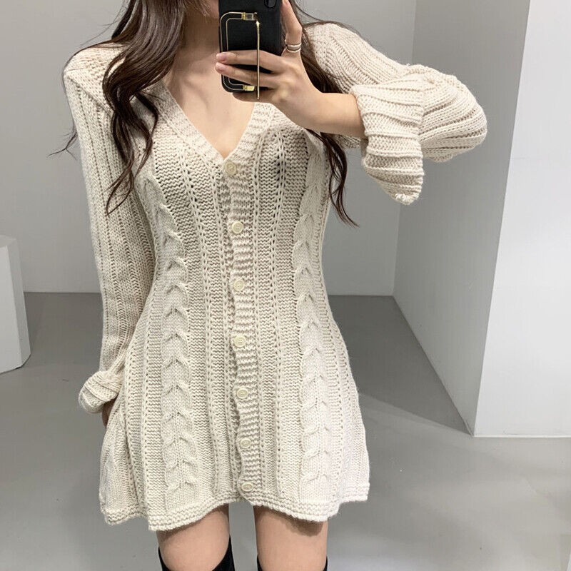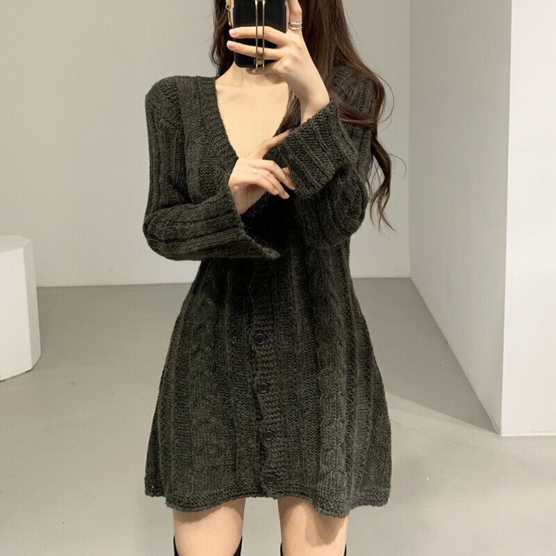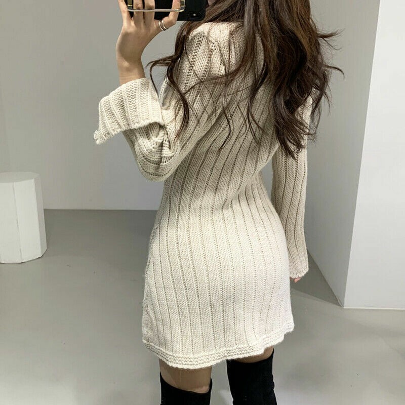 Womens V Neck Long Sleeves Knitted Sweater Dress Korean Fashion Mini Skirt Tops